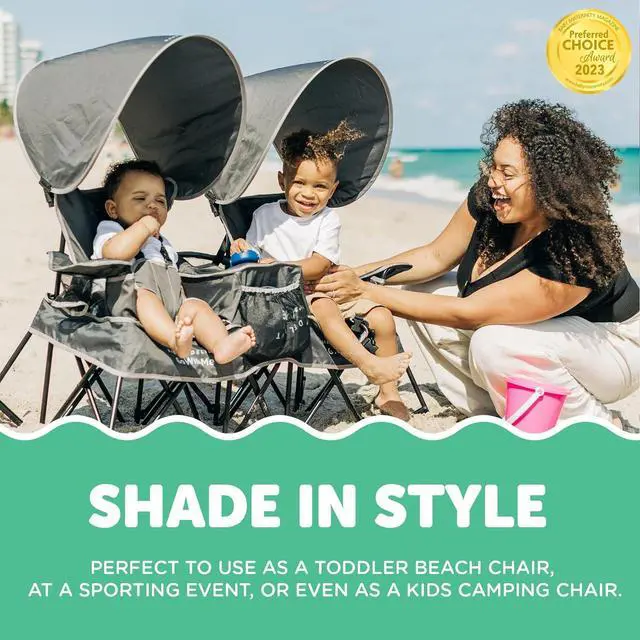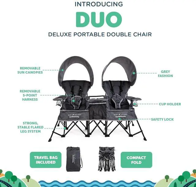 The Go With Me Duo Deluxe Portable Double Chair is perfect for twins, siblings or besties! This one-of-a-kind chair unfolds to reveal two separate seating areas for little ones ages 3 months 75 lbs. Added safety features include a strong, stable flared leg system, as well as locking mechanisms and a 5-point safety harness on each seat (which can be removed as the children grow). For outdoor adventures two removable sun shades can be added quickly and easily. The built-in cup holders are sure to come in handy for bottles as well as sippy cups. And for storing snacks, toys or books, easily accessible storage pockets are included between the two seats. When its time to get up and go, simply fold the Duo up and place it into the included storage bag. Ready? Set. Adventure, together!