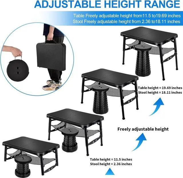 Our collapsible table and folding stool are fully adjustable to suit your needs. The folding table's height range is adjustable from 11.5 to 19.69 inches, while the telescopic stool's height range is adjustable from 2.36 to 18.11 inches. This means that both adults and children can easily use them in any setting - from work to play, dining to relaxing.