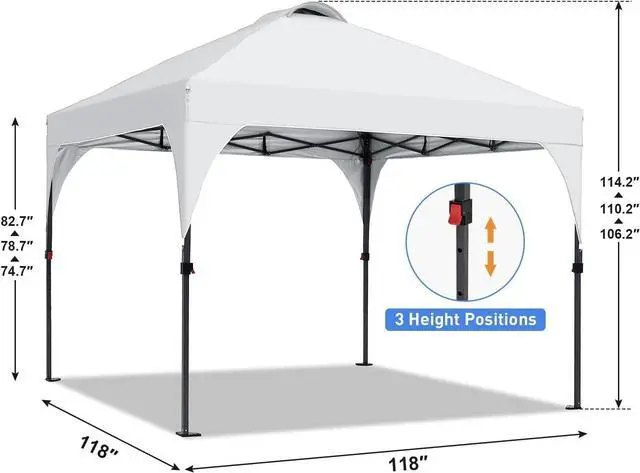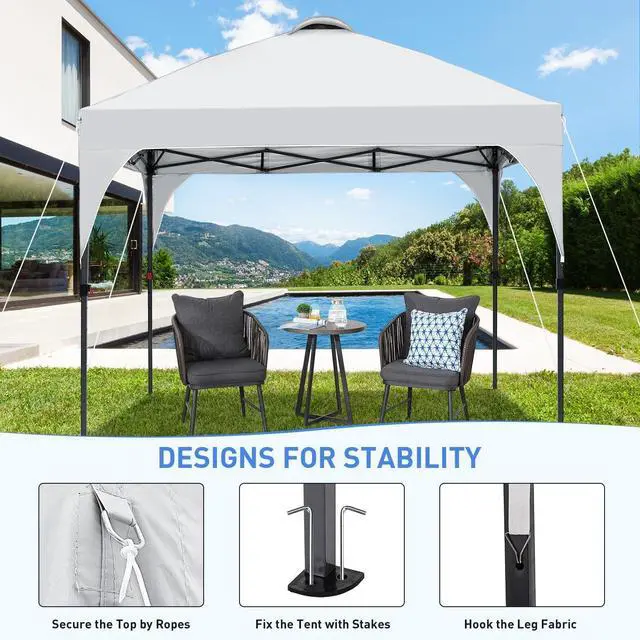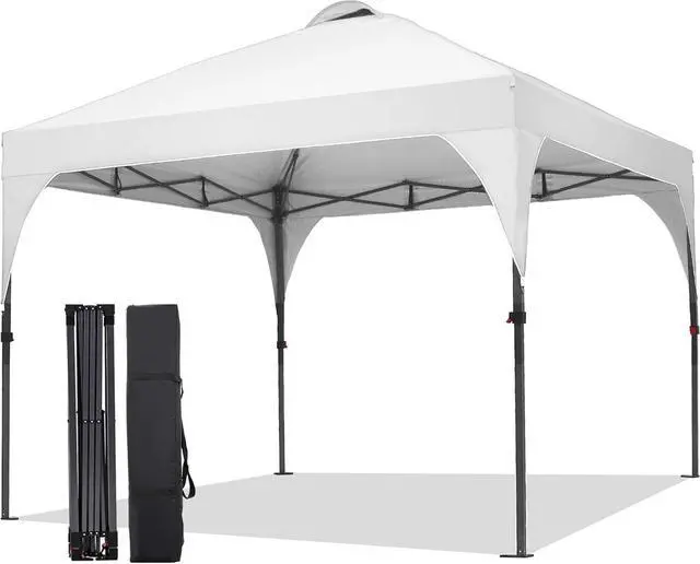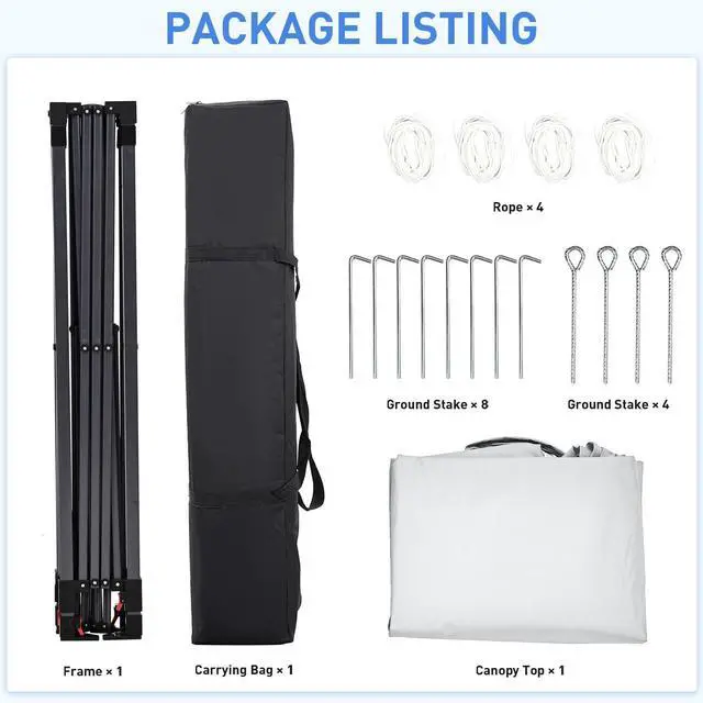 Quick AssemblyIt only needs 2 people to set up or disassemble this commercial canopy tent. Package includes 10x10 Pop-Up Canopy Frame + Top Cover + 1 Carrying Bag + 4 Ropes + 12 Ground Stakes. Perfect for patio, backyard, deck, and beach use.