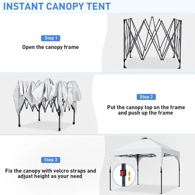 Compact and PortablePacking the folded pop up tent into the carrying bag, you can easily bring it to the park, beach, campsite, or anywhere you want to go. The canopy tent will give you a shady and cool shelter on sunny or rainy days.