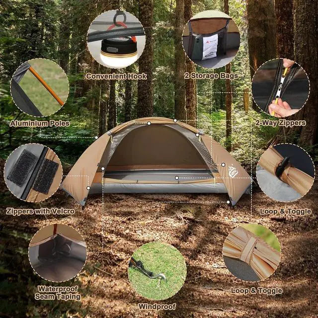 Stable]: Outer tent with the water proofing value of 3500mm, seam taping on the zipper, velcro wrap with PVC & seam taping, 4 bottom corner with seam taping, which are high and good enough to prevent the water from entering even under the big heavy rain; Strong aluminium pole construction and the anti tearing rip-stop fabric which greatly help to prevent the hitting and tearing on fabric from the strong wind under the bad weather with big storm.