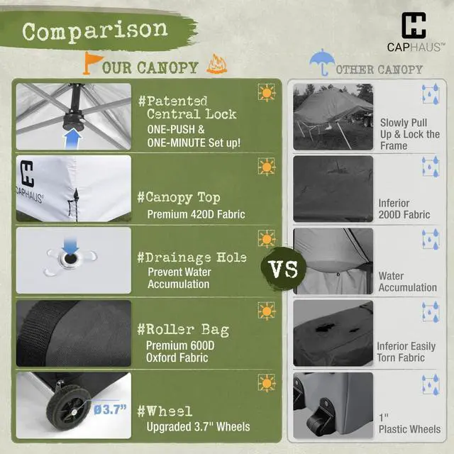 Durable Superior 400D Fabric - Experience superior quality with the pop up canopy! Our canopy top features a 400D fabric silver-coated inner cover, providing superior waterproofing, UV protection, and flame resistance compared to common 150D canopies. Plus, our canopy top includes drainage holes on each side to prevent water accumulation. Don't settle for less! Choose our canopy for your next outdoor adventure!