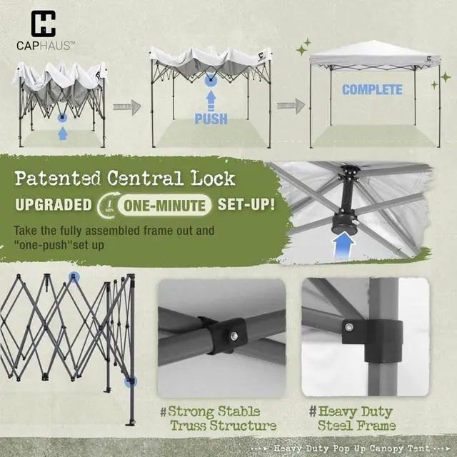 Easy Set UpWith our patented central lock mechanism, the central hub can lock all four legs in place, making it possible for one person to set up or take down the tent in just one minute with a single push.
