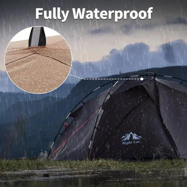 Tear-stop Material and Waterproof: 210T Tear-stop fabric with waterproofness PU 3000mm, waterproof tape on every seam, ensures the inside hiking tent is totally dry under any rain situation even in the storm. Aluminum Pegs, guylines make this 4 seasons tent stable in a windy day