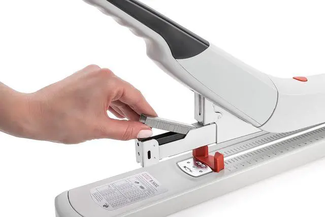 The B56 XL Heavy Duty Long Arm stapler is designed for high-volume stapling of up to 170 sheets with minimal effort. It features an anti-blocking system to prevent jams, a 9.75" throat depth for stapling booklets, and a bypass system that prevents staple overlap when stapling fewer sheets. This stapler is German engineered and works best when paired with 23-gauge premium staples.