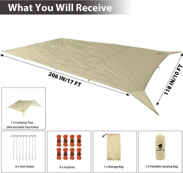 NOTE: Please be aware that tarp poles are NOT INCLUDED; however, you can use strong sticks as an alternative. The tarp comes with stakes and guylines for basic setup
