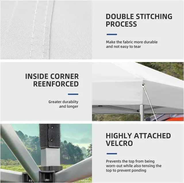 Pop up canopy frame is made of high-strength steel and alloy material, durable and anti-corrosion. the stress points at the junction of the top rods are reinforced, making it longer service life. Straight legs design, 3 levels of height adjustment, and an improved toggle leg adjustment device make it easier to install and adjust the canopy.