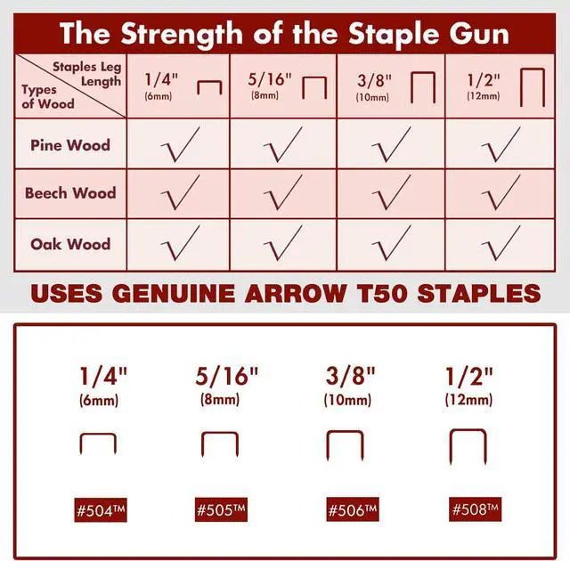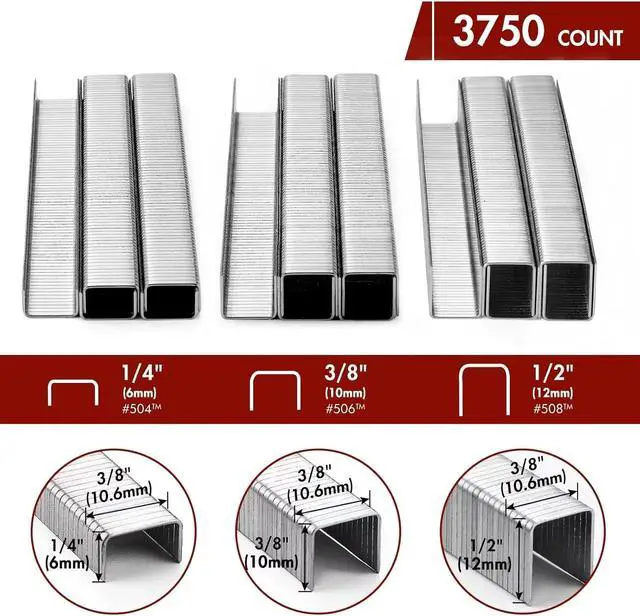 3750 Pieces T50 Staples Come with 3750 Pieces 1/4" (6mm), 3/8" (10mm), 1/2" (12mm) Arrow T50 staples (Each 1250 Pieces), providing options for a variety of projects.