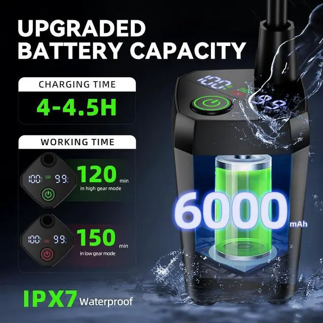 Upgraded High-Capacity Battery: rechargeable shower pump comes with an upgraded 6000mAh high-capcity battery which provides up to 2.5 hours of non-stop usage on low mode (2 hours on high mode). It comes with a USB-C fast-charging port to allow for convenient charging from a power supply. The charging port also comes with a silicone waterproof cover for safe use and prevent short circuit.