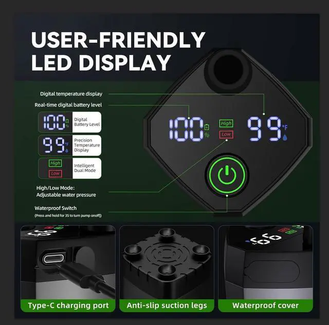 Smart LED with Temperature Display: camping shower kit also features an upgraded smart LED display that shows the current battery life, the running mode (high/low mode) as well as the water temperature in Fahrenheit. No more guessing the temperature and prevents scalding from hot water with our camping shower