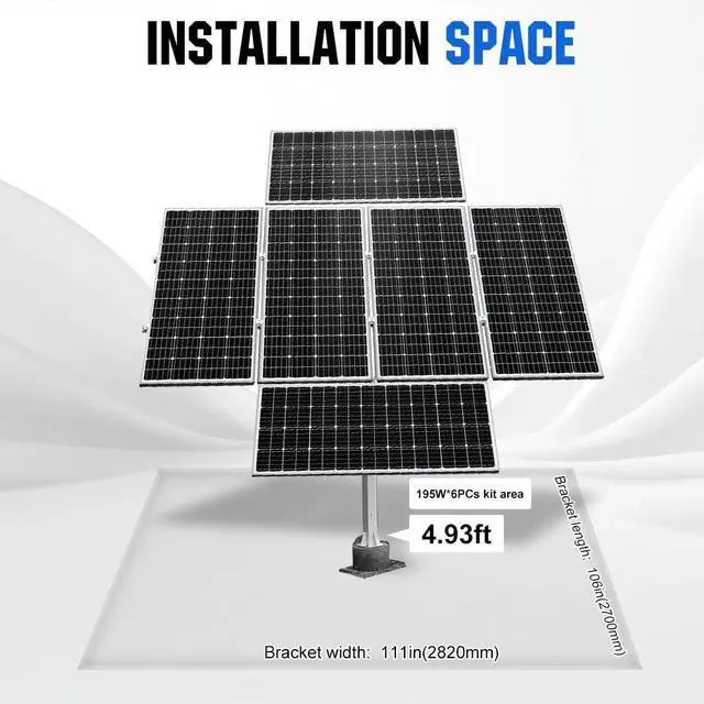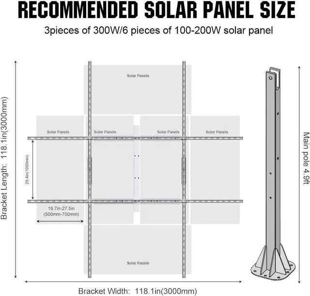 [For different panels] Designed space for 6 pcs 195w panels. For different panels, please calculate according to the length information provided. Installation dimensions are 1680mm high * 3000mm long * 3000mm wide ( 66.1" high * 118.1" long * 118.1" wide), main pole height is 4.9 feet (1493mm). With 1500N driving rods