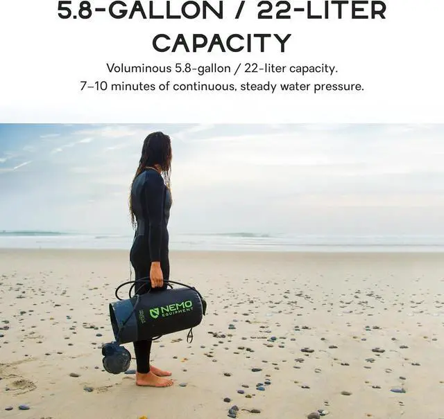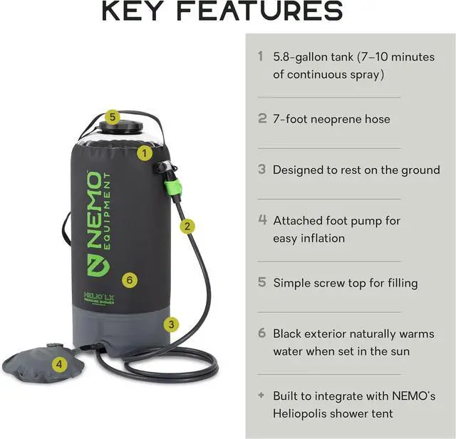 Helios 2.9 -gallon tank and Helio LX's 5.8 -gallon vertical reservoirs are equipped with large ports and easy-grip screw caps for effortless filling and emptying of the tanks. (Bonus: The large opening aids with fully drying and cleaning the interior, as well. ) Attached to the reservoir is a 7-foot-long neoprene hose with two-stage nozzle that can be manually triggered or set to continuous spray mode for tasks like showering or camp dishes. The extra-long hose is designed to especially complement our Heliopolis privacy shelter & shower tent, which has a fitted nozzle holder for a hands-free shower experience for luxury in the backcountry.