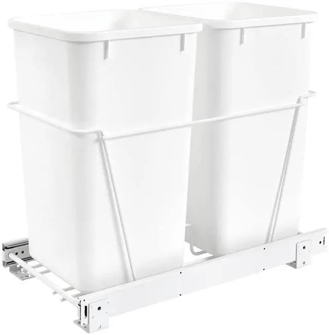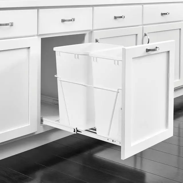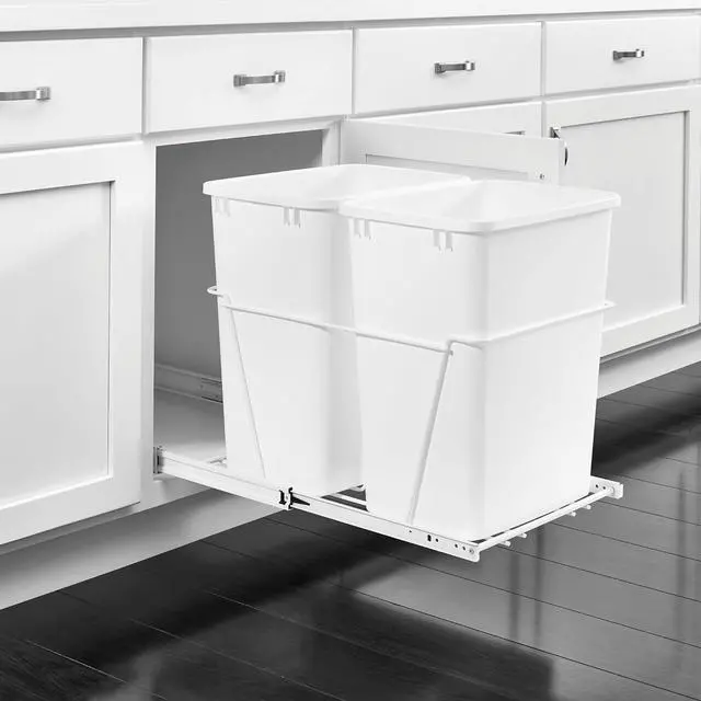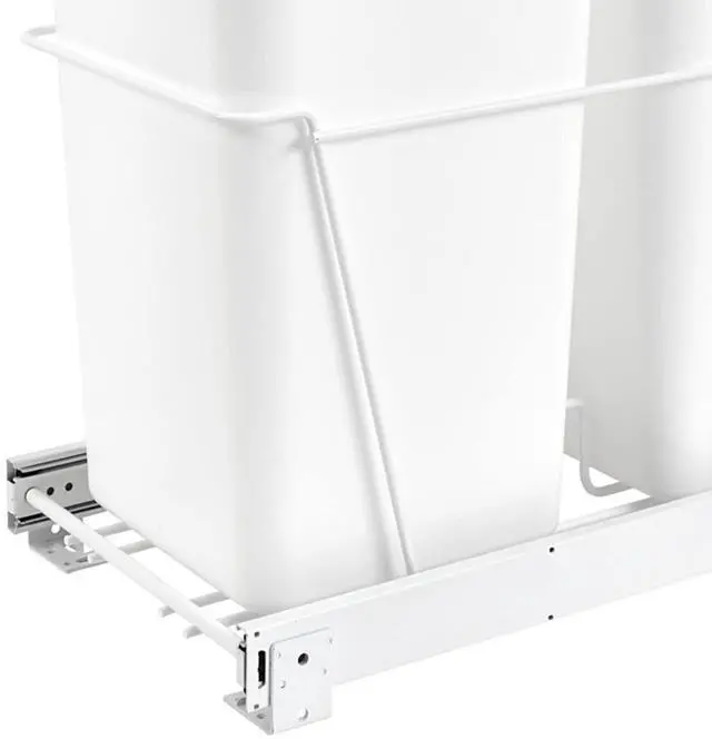 Durable Dual Trash Bins: Heavy-gauge wire construction frame effortlessly slides in and out on full-extension, ball-bearing, 100-pound rated slides