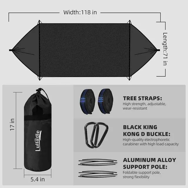 Easy to install and carry: The included tree belt and carabiner make it easy to set up and the length is adjustable. Two foldable aluminum support rods can be easily inserted into the mosquito net, saving your setting time. This hammock is made of high-quality parachute nylon, which is very light. The whole hammock weighs only 3.2 pounds (118 inches x 71 inches) and is equipped with a compact carrying belt, making it easy to pack and take anywhere.