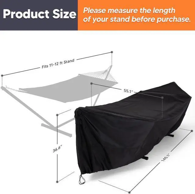 Dimension: 145.7"L * 55.1"W * 36.6"H, suitable for 11-12ft hammock frame and almost all hammocks on the market