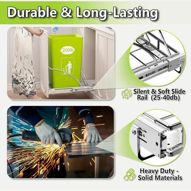 The pull out trash can under cabinet design allows for quick removal and cleaning of the trash can, and the slide rail material is rust-proof and moisture-proof, making it suitable for humid kitchen environments.