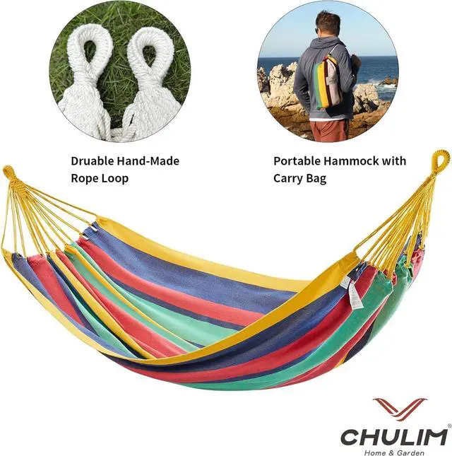 • Brazilian Double Hammock for Home and Garden,Our hammocks are made from soft woven cotton/polyester blended fabric,and provide 2 tree-friendly straps for quick hanging.It's ideal relaxation space for family and frineds.