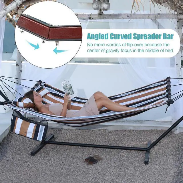 Super Large Hammock: 55in width x 79in length large hammock bed can easily accommodate 2 people to enjoy the leisure time simultaneously (maximum 450lb capacity). The pillow is lengthened to 35.4 in for two people. Besides, the hammock comes with a detachable side pocket for phone, books, cups and other stuffs for your convenience.