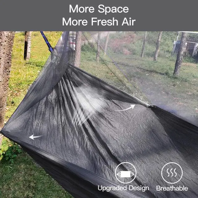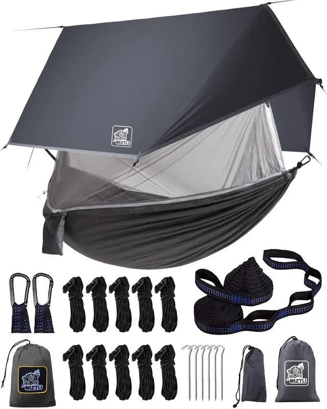 Top Quality Material: hammock with netting is made of high quality parachute nylon materials and special designed durable net fabric. Especially, our hammock tent tarp featured with excellent 3000mm PU waterproof and windproof can effectively prevent stormy,fierce wind and snowstorm