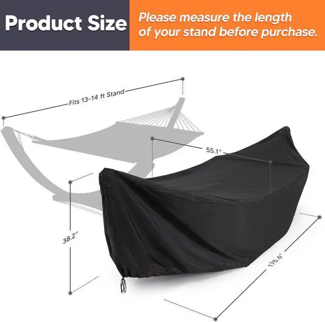 Dimension: 175.6"L * 55.1"W * 38.2"H, suitable for 14ft arc hammock frame and almost all hammocks on the market