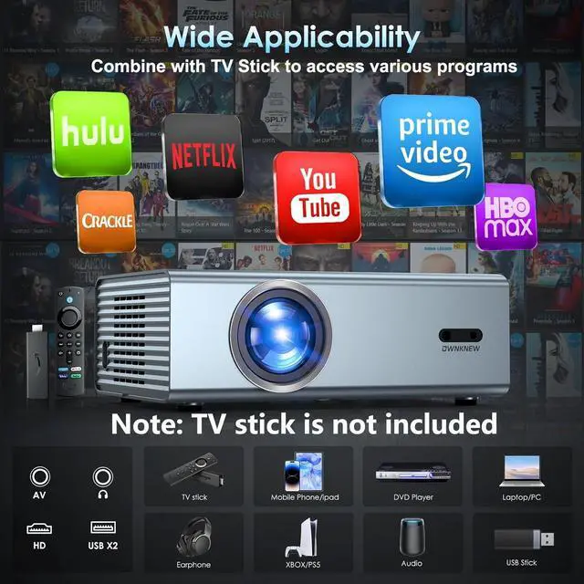 Multi-device Connectivity & After-sales Service As an enhanced version of the video projector, it has multiple ports including HDMI, USB, AV, and a 3.5 mm headphone jack for easy connectivity to cellphones, WiFi, TV Sticks, Android devices, USB flash drives, computers, PCs, PS5, game consoles, and more.