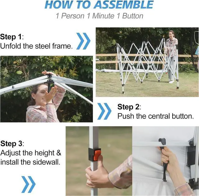 : The pop-up instant canopy is equipped with a compact wheeled tote bag that is lightweight and durable, optimized in size for easy carrying and storage. Includes detachable side walls, 6 built-in pockets, and low profile accessories (comes with 4 weight bags, 4 guy ropes, and 8 stakes to enhance stability). Whether on the beach, camping or market, the portable design allows for flexible usage scenarios