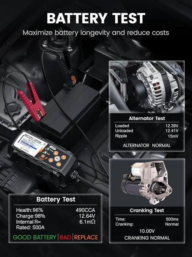 BATTERY TESTING: Never get stranded again. Its smart chip and rugged clamps deliver > 99.6 % accuracy. Instantly check battery health, voltage, current and cranking with one tap. Detect hidden issues early to avoid unexpected breakdowns, save on towing, repairs and premature battery replacement