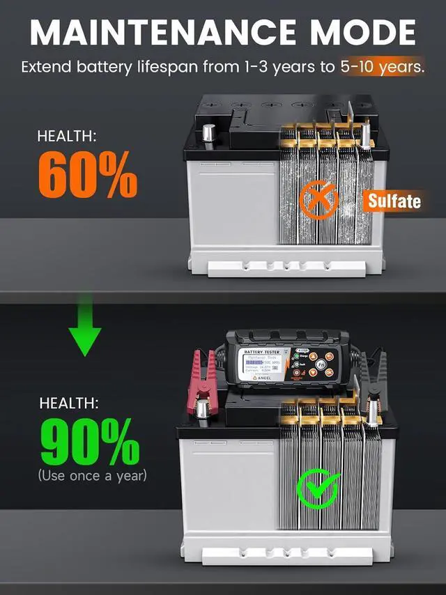 BATTERY MAINTENANCE: Most chargers stop at charging, but BT521 goes further. Pulse technology restores up to 90% lost capacity and clears buildup during charging to help prevent long-term damage. Regular use can extend battery life 2-3 times and reduce replacement costs(Note: Check once a year)