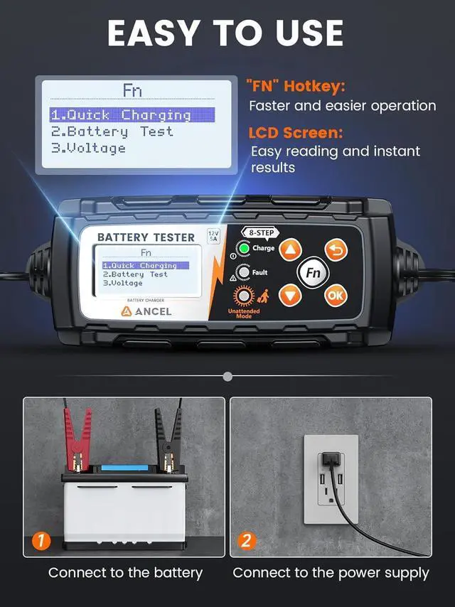 USABILITY: Plug-and-play design eliminates pre-calibration, just connect to power and clamp electrodes for 3-second auto-start. The LCD screen tracks real-time voltage, charging progress, and battery health with intuitive visuals. Streamlined operation meets robust protection, optimizing charging efficiency and extending battery lifespan