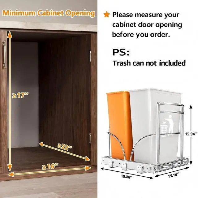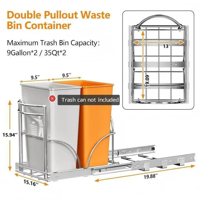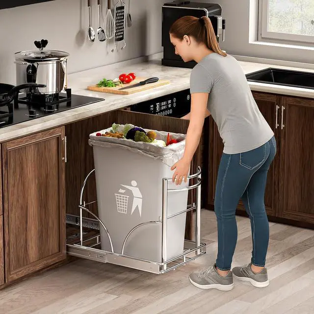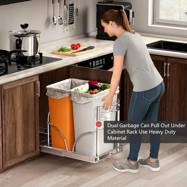 Smooth & Stable Pull Out FrameThe under sink trash can slides in and out along the commercial-grade ball-bearing tracks. With solid build, it won't deform and can hold up to 200lbs load capacity with no harsh noise after repeat daily use. For more convenient use, we specially designed 2 layer handle to easily access to the trash bin.