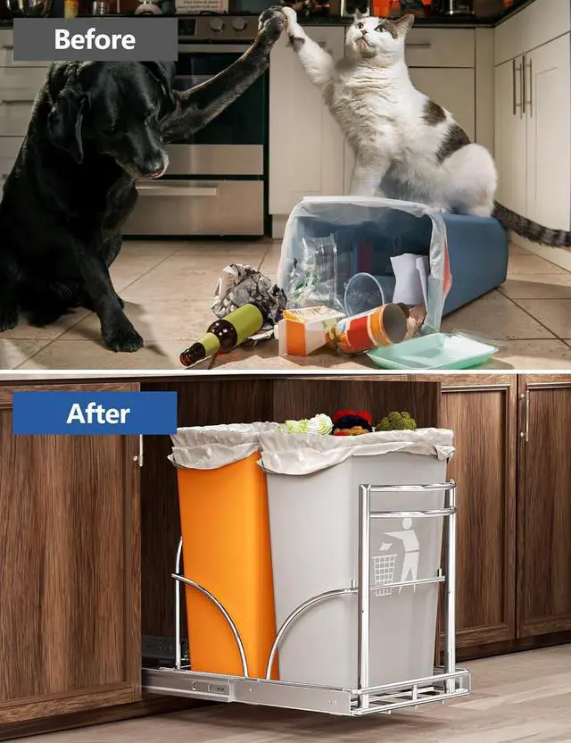 Hide the Waste Basket and More Space to Move AroundThe pull out trash can under cabinet easily slides in and out your recycling bin or garbage bin under the cabinet and does not take up the floor space. The under sink trash can helps to leave more moving space for you in your apartment, rental housing or RV. The hidden design makes it a real dog proof trash can. It effectively prevents children or pets exploring the wastes and the trash can being kicked over.