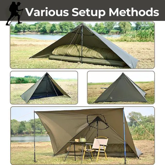 Quick to Set Up. The reusable quick cape shelter is easy to setup and take down. If you don't have a trekking pole on hand, a simple stick will suffice. Set it up low for survival or high for seating and rest, or use it as a wind blocker for extra privacy outdoors. It comes with a free suspension gift containing 5 Y-Aluminium tent stakes, 1*10' Light Reflective Tent Guyline for easier set-up.