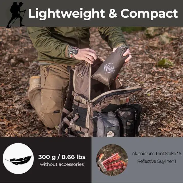 Lightweight and Compact. This pocket tent weighs only 300g/ 10.6 oz and suspension weighs 85g/3oz. It packs down to the palm of your hand which is 22*12*10cm/ 8.7 * 4.7 *4 inch for easy storage and mobility. With a compact stuff sack, one can easily take it anywhere. This is the ultimate shelter for a single-person go-bag.