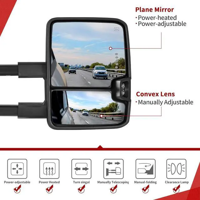 1. Trailer tow mirrors will work for compatible vehicles with listed functions only. If your vehicle does not have those functions, these mirrors may not function well.
