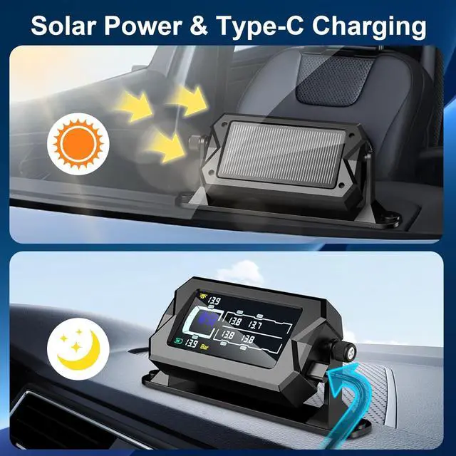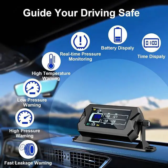 3Level Bright LCD3× Larger Than Conventional Screens The vibrant 3.6 display, with a built-in clock, is three times larger than standard TPMS screens. This ensures pressure and temperature readings are always crystal-clear, whether you're driving day or night, so you never miss an update at a glance. The included 360° rotating bracket, with a secure screw on the right side, allows you to fix the display at the perfect angle for easy viewing while driving.