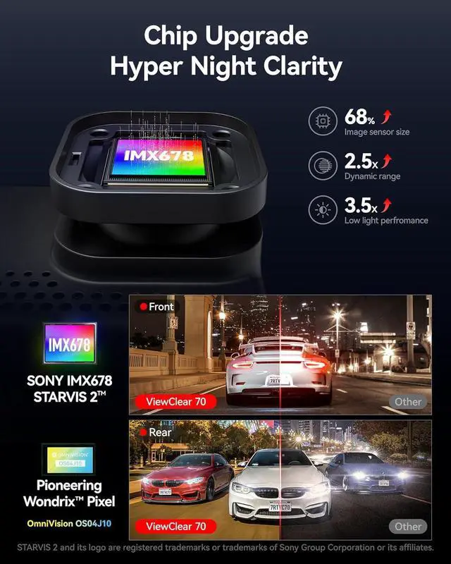 [24 Hour Parking Monitor*] - The dashcam front and rear camera ViewClear 70 offers 24-hour parking monitoring, ensuring constant protection. With Collision lock recording, it saves footage during impacts. The upgraded Time-lapse feature delivers true color reproduction, capturing clear images even in low-light environments. This Low-light Parking Guard provides enhanced security and peace of mind, day or night (Hardwire kit need to be bought separately)