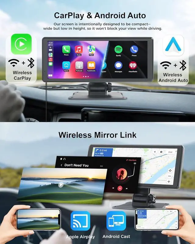 Please note: Our screen is intentionally designed to be compact wide but low in height, so it wont block your view while driving. The backup camera must be wired from the CarPlay screen to the rear of the vehicle for power, not a wireless connection.
