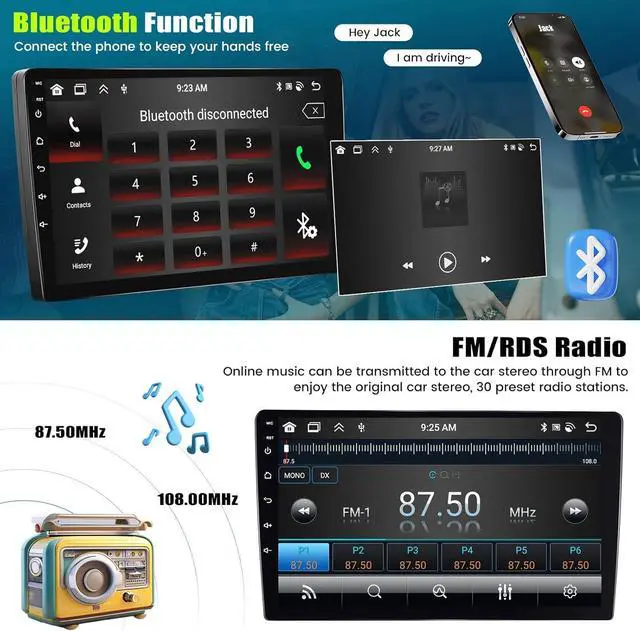 Bluetooth&FM/RDS Radio: The radio comes with high quality FM/RDS radio, equipped with 30 preset radio stations, Internal equipment high-end radio chip, it have powerful noise reduction and anti-interference ability. You can listen to real-time traffic, news boradcasts, weather forecasts, etc. Car stereo with bluetooth make sure without distracting your attention from the road when answering important calls, Support hands-free calling, listening music and etc.
