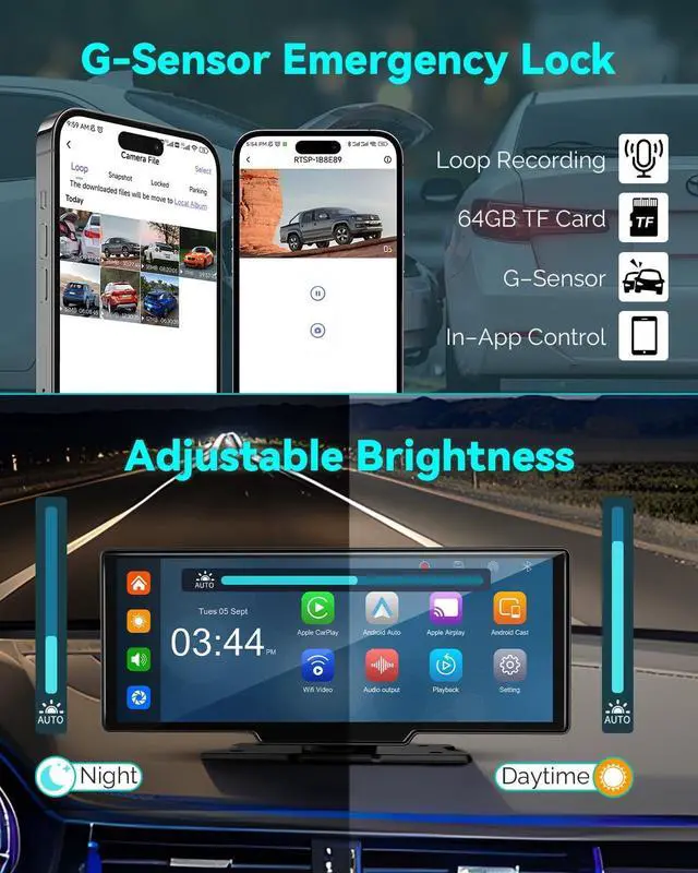 Intelligent Brightness Adjustable Touchscreen - Android auto screen for car has a built-in light-sensor. In auto mode, portable wireless carplay screen intelligently senses ambient light changes, and automatically adjust the screen brightness, ensuring a driving experience free from discomfort and glare.