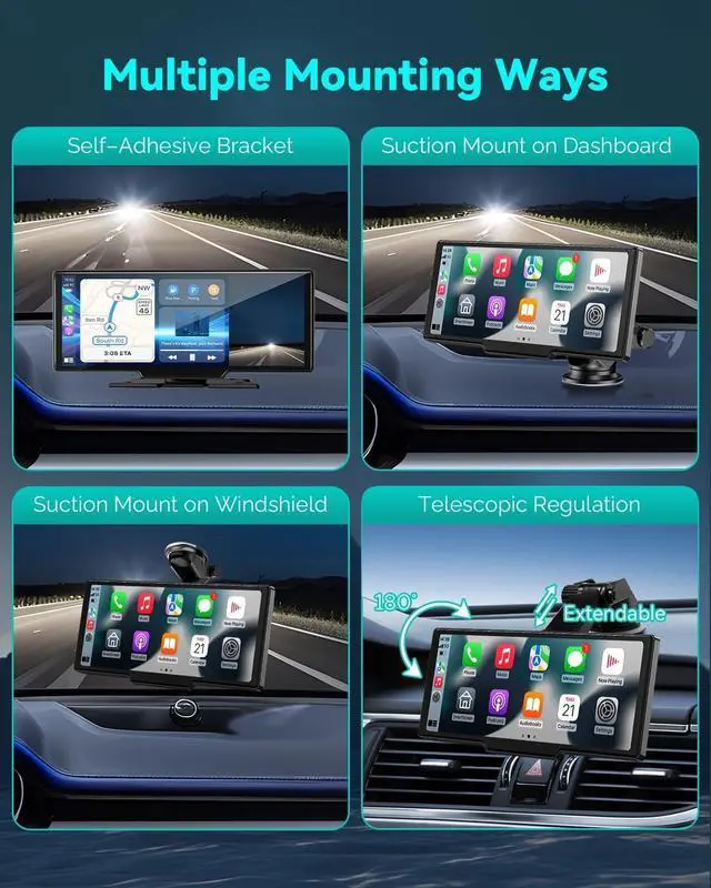 Wider Compatibility & Optional Stands - 10inch portable car stereo is suitable for most 12-24V vehicles and phones with iOS 10+ or Android 11+ system. Included 2 kinds of stands - Vertical Bracket with strong adhesive and rotatable Suction Cup Holder - that allow you to easily mount car audio receivers on dashboard or windshield, and adjust the angle so as not to block your driving view.