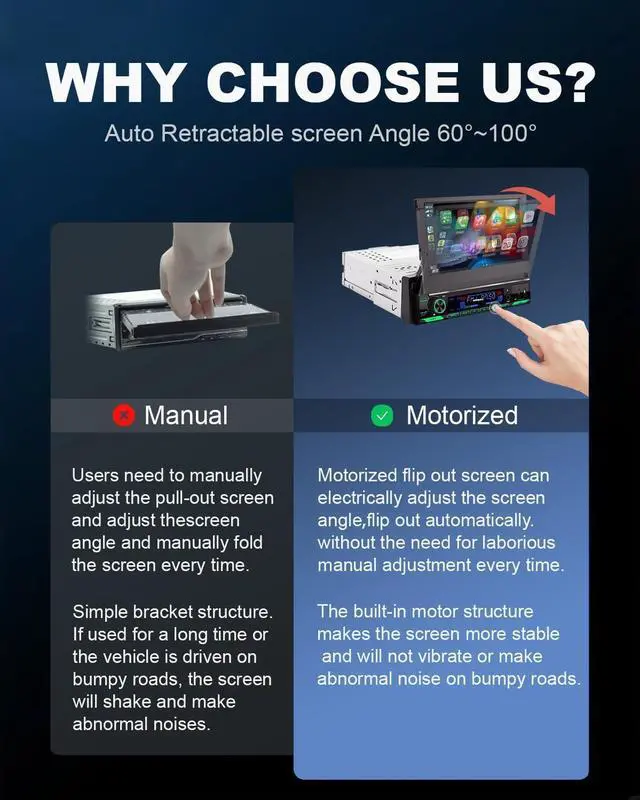 Adjustable screenEnjoy the perfect viewing experience with our motorized flip-up car stereo featuring an adjustable-angle touchscreen