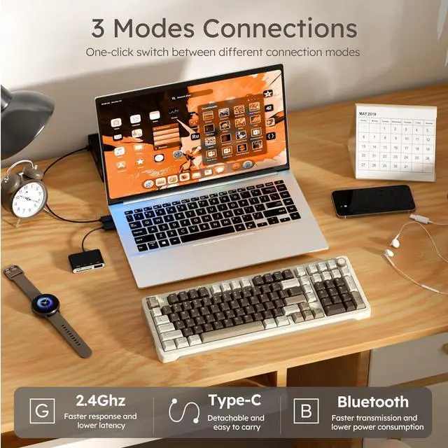 Low Latency & Long Lasting Performance The custom keyboard offers low-latency 2.4G wireless and Bluetooth connectivity, allowing up to 3 devices to connect simultaneously in BT mode. Its 3150mAh rechargeable battery provides up to 260 hours of use with RGB off, perfect for extended gaming or work sessions