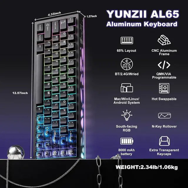 Dynamic RGB Lighting with Transparent Keycaps: With 16.8 million RGB backlit and south-facing LEDs, AL65 light up keyboard offers vibrant lighting effects and 360° side-surround illumination. The hollow design of the gaming keyboard wireless enhances the lightings visual appeal, while additional transparent PC keycaps add further customization options. As a gaming accessories, this creamy mechanical keyboard is perfect for gaming in dark environments, this RGB keyboard ensures an immersive experience for gaming setup, gamer and RGB enthusiasts