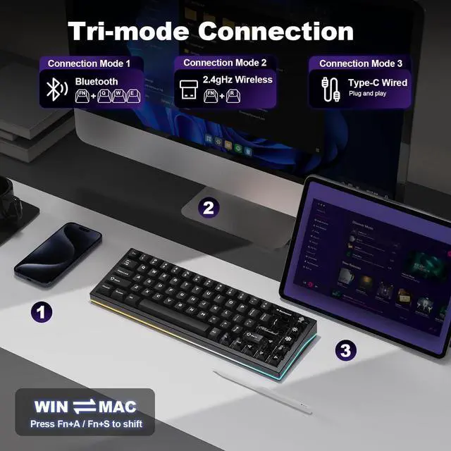 Battery: The wireless keyboard has tri-mode connectivity, easily switch between Bluetooth, 2.4GH z wireless, and USB-C wired modes. The Win / mac keyboard connect up to 5 devices, like tablet, PC, phone, laptop simultaneously and enjoy uninterrupted usage thanks to the high-capacity 8000mAh battery, 1000hz polling rate, designed to keep you focused on gaming, work, or programming without frequent recharging