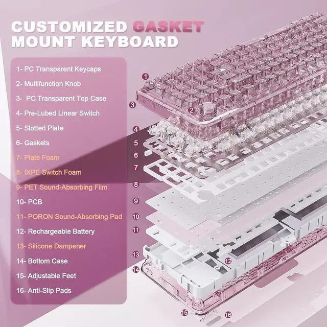 Gasket Mount Keyboard with Satisfying Sound: Experience a milky, creamy acoustic profile with X98 gasket mount keyboard, which composed with 5 layers of dampening materials (Poron, IXPE, Silicone, and Sound Enhancement Pads). The gasket structure of the PC gaming keyboard better optimizes resilience and stability, offering a softer, more elastic hand feel with a solid keystroke response