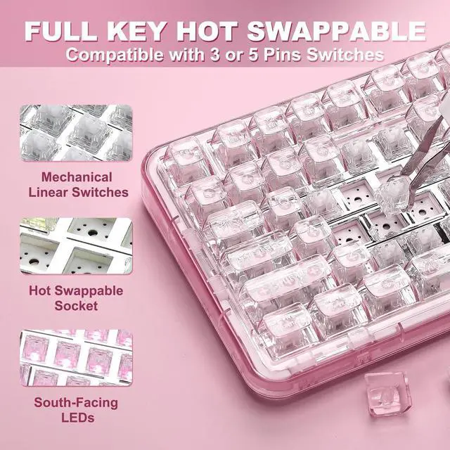Pre-lubed Switches: X98 Custom keyboard features a hot swappable socket compatible with 3-pin and 5-pin mechanical switches. Equipped with pre-lubed Snow Switches, the pre-lubed switches of the creamy mechanical keyboard offers silky-smooth, creamy typing and quiet actuation, perfect for users who wants out-of-box creamy and reliable performance