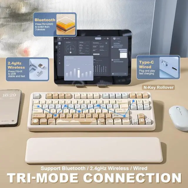 Battery: B87 offers versatile connection options with Bluetooth, 2.4 GHz wireless, and USB wired modes. Seamlessly switch between up to 5 devices, making it ideal for multitasking on Mac, Win, Mac, Linux, iOS, and Android. Built-in 4000 mAh battery, allowing for extended use without frequent charging, making it great for both home and office
