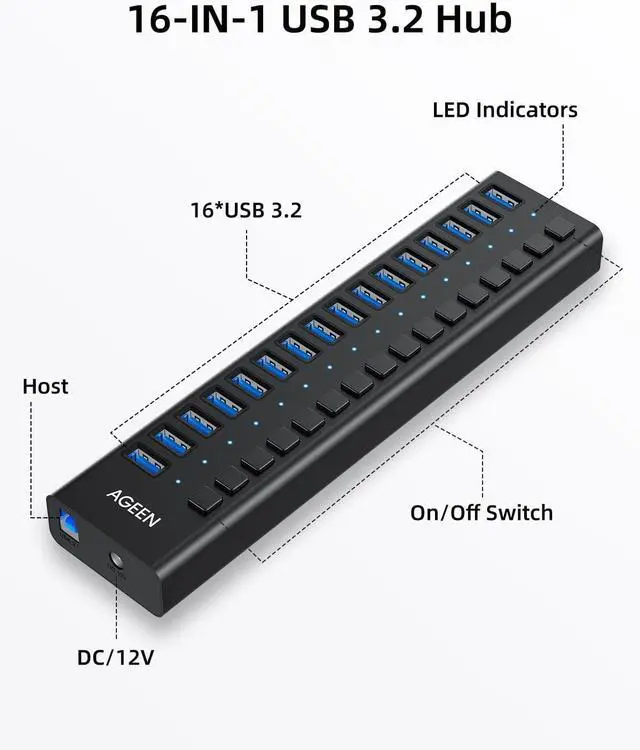 : 16 high-speed USB 3.2 ports can connect USB peripherals or devices and allow the transfer of data up to 10Gbps, which means you will transfer an HD movie in seconds. It's backward compatible with USB 3.0 / 2.0 / 1.1, the fantastic experience you will get. 96W Power AdapterSuper powered USB 3.2 Hub, with 12V/8A configurations, convenient and powered for all your devices.