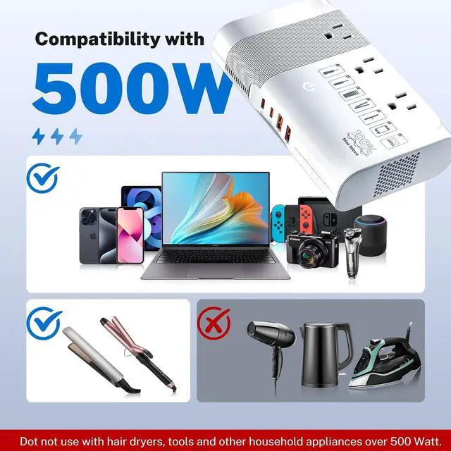 Fast Multi-Device Charging: Charge 7 devices at once with 3 US sockets, 2x20W USB-C (PD), and 2x18W USB-A (QC).. Ideal for families or professionals with multiple gadgets, it handles phones, tablets, laptops, and small appliances efficiently. Total 500W power limit prevents overloads, keeping charging safe and steady.