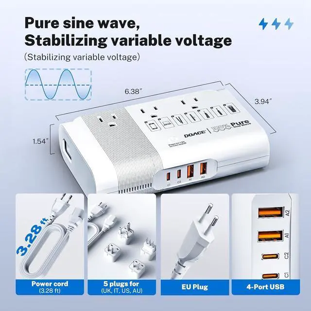 Compact Design & Smart Safety: This universal travel adapter fits easily in luggage. A touch switch controls power. Fire-resistant materials and a silent fan add safety, perfect for hotels or quiet environments. Includes a detachable EU cord and 4 plugs, storing neatly for stress-free travel.